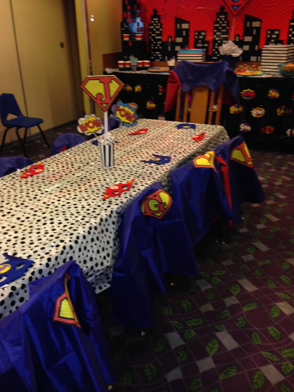 I found really cool printables from Anders Ruff. I used these for centerpieces and to put on the back of the capes. Anders Ruff Super Hero