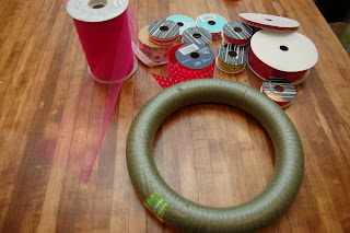Materials Needed: Styrofoam wreath, any size. (I used a small wreath so it would fit on my office door) Multiple patterns of Ribbon. I used a mixture of ribbon with and without wire. However, I thought the wire ribbon worked better to shape once the wreath was completed.